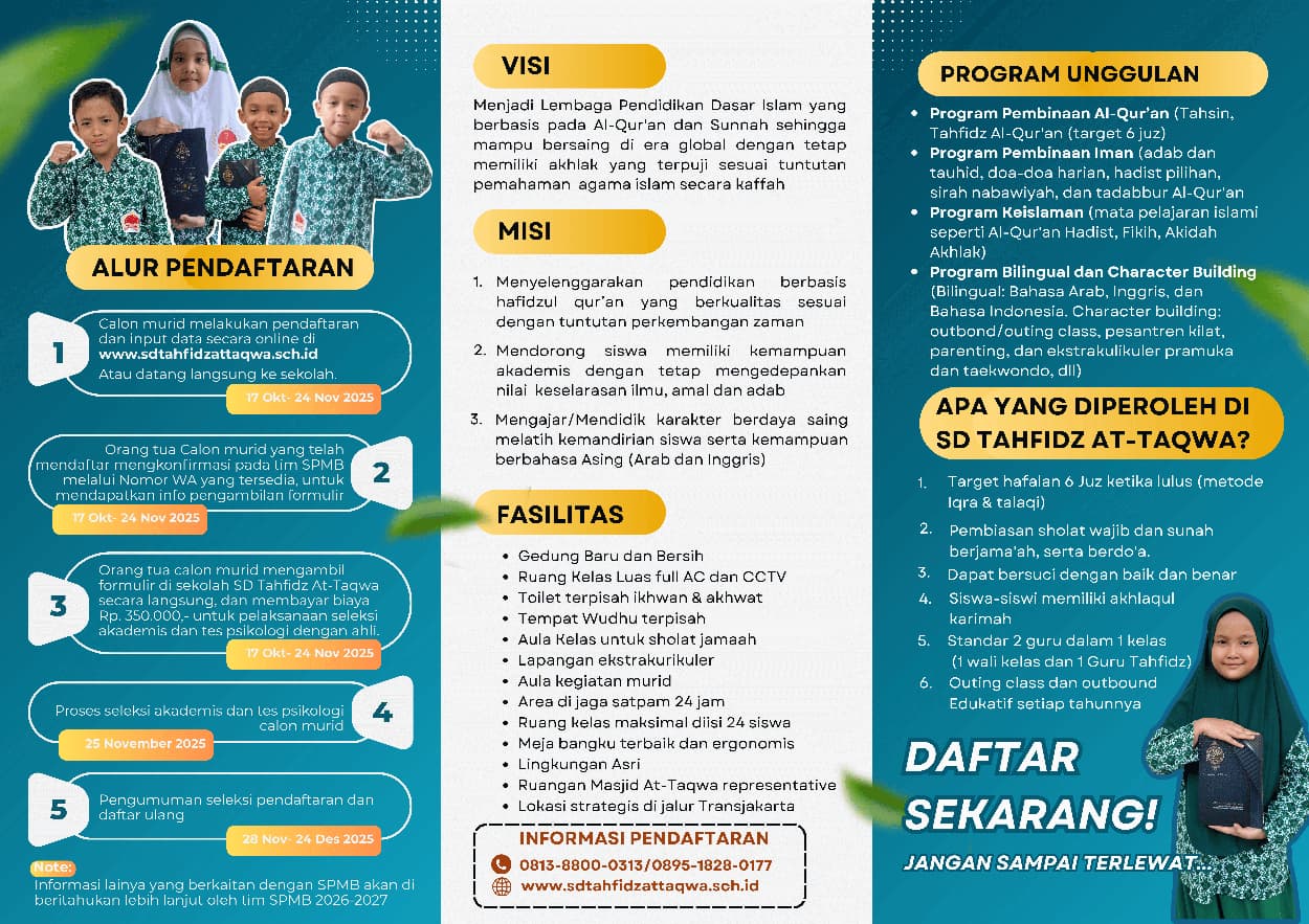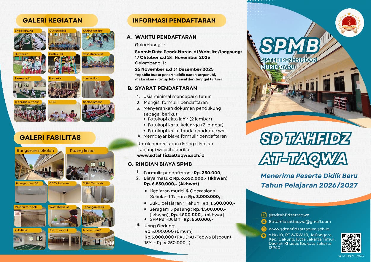 Selamat datang di portal resmi Sistem Penerimaan Murid Baru (SPMB) SD Tahfidz At-Taqwa PIK. Melalui sistem ini, kami membuka kesempatan bagi putra-putri terbaik untuk bergabung dan tumbuh bersama dalam lingkungan pendidikan yang bertujuan mendidik generasi Qur,ani, Berprestasi dan Berakhlak mulia.